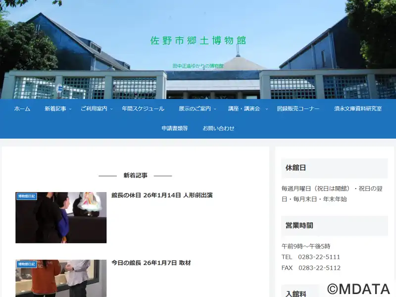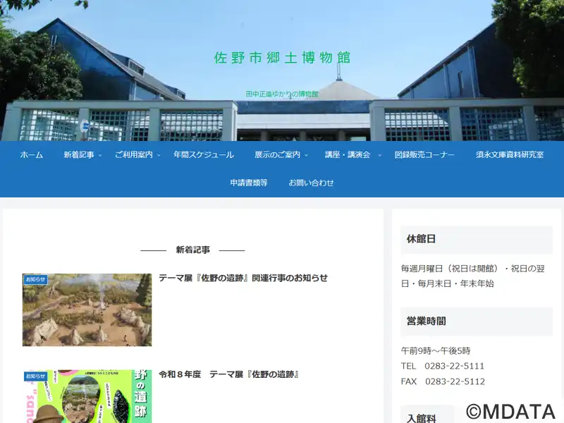 1983年に佐野市に開館した地域歴史博物館。佐野の原始から近現代にかけての歴史や民俗資料を展示。特に、足尾鉱毒事件の解決に生涯を捧げた政治家・田中正造に関する約1万点の資料を収蔵・展示している。常設展示には、市内の遺跡からの出土品、中世の山城、近世の天明宿、佐野の鋳物師による「天明鋳物」に関する資料、また、オランダ船リーフデ号ゆかりのエラスムス木像の複製、機織り機や際物なども幅広く紹介している。