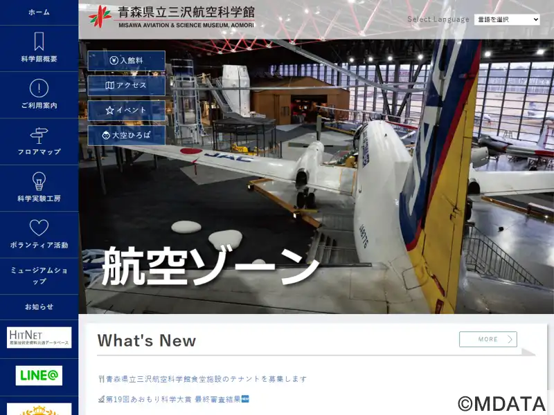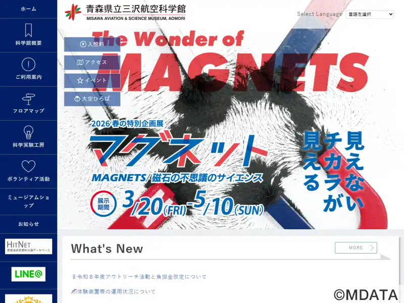 青森県三沢市大空ひろばの一角にある航空と科学の博物館。三沢飛行場に隣接し、航空史の継承と科学する心を育む拠点として2003年に開館した。世界初の太平洋無着陸横断飛行を成功させたミス・ビードル号の復元機や、戦後初の国産旅客機「YS-11」など歴史的航空機の実機を展示するほか、空を飛ぶしくみや科学の原理を学べる体験型装置が充実。ワークショップなどを行う科学実験工房、ライブラリー、展望デッキも備える。