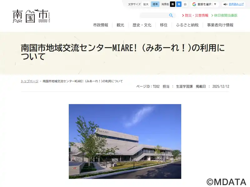 高知県南国市に2021年に開館した、500席の多目的ホールと公民館機能を持つ交流拠点施設。ホールは1階をすべて可動席とし、プロセニアム形式と反射板形式に対応した舞台設備を整え、催事の内容に応じて柔軟な利用が可能。また、地元産ヒノキ製の家具が置かれた吹き抜けの交流ロビー、会議室、多目的室、調理室、和室、ギャラリー、屋外広場などが設けられ、利用者の要望を反映した「市民が主役となる場」を提供している。