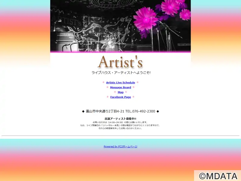 富山市中央通り沿いに位置する隠れ家的なライブハウス。ステージ壁や天井に描かれた迫力あるペイントが印象的で、プロやアマチュア、ジャンルの垣根を超えた表現と交流の場として、恒例イベント「Artist's Live」やセッションライブが、週末を中心に開催されている。バンド、アコースティック、弾き語り、教室の演奏発表会などに利用されている。また、生ピアノが常設されており、公開リハーサルや練習利用も可能。