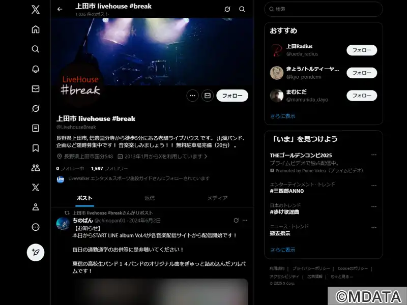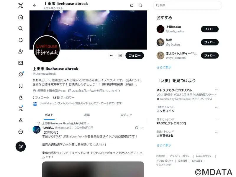 上田市にある1987年創業の老舗ライブハウス。1997年に旧丸子町から上田市国分の国道18号沿いに移転した。音楽や人との出会いを通じて成長できる場所を目指し、バンド・弾き語り・DJなど、幅広い世代・ジャンルのライブやイベントが行われている。また、地元ミュージシャンの活動拠点として、日頃のバンド練習やギター・ベース・ボイトレなどのレッスンも提供している。信濃国分寺から徒歩5分、無料駐車場も20台あり。