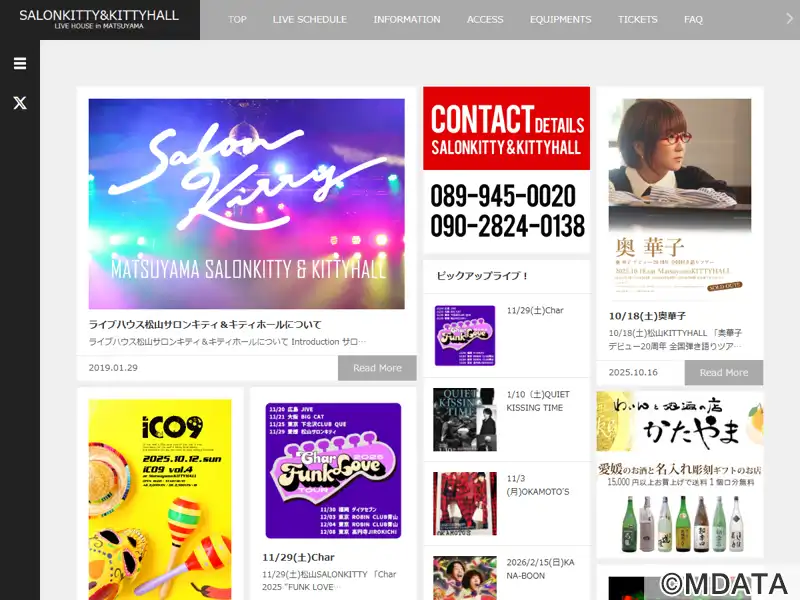 松山市河原町のキティビル内にある2つのイベント施設。1F「松山サロンキティ」は、1994年開業の、最大400人収容可能なライブハウスで、ロック、ヴィジュアル系、アイドルなどのイベントが開催されている。ロッカーや手荷物の預かりもあり、快適なイベント空間を提供している。また、5Fの「松山キティホール」は、108席の劇場スタイルの多目的ホールで、アコースティック、演劇、お笑いライブなどが開催されている。
