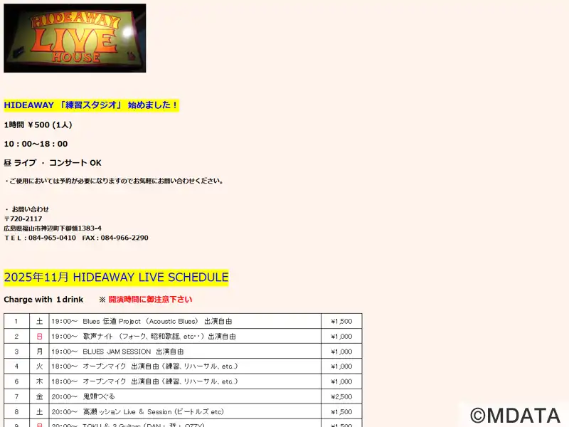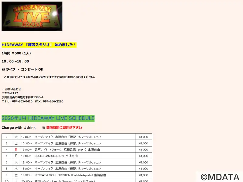 1985年11月に福山市神辺町のR313沿いに創業したライブハウス。店名の「隠れ家」の名にふさわしく、照明を控えた落ち着いた店内では、日々アコースティックやブルースなどのライブが開催されている。マスターのTOKU氏は、楽器を奏でて歌う、ボブ・マーリーに魅了されたミュージシャンであり、自らもステージに立つ。また、スタジオとしての利用も可能で、ライブハウスでの本番さながらに個人やバンドの練習ができる。