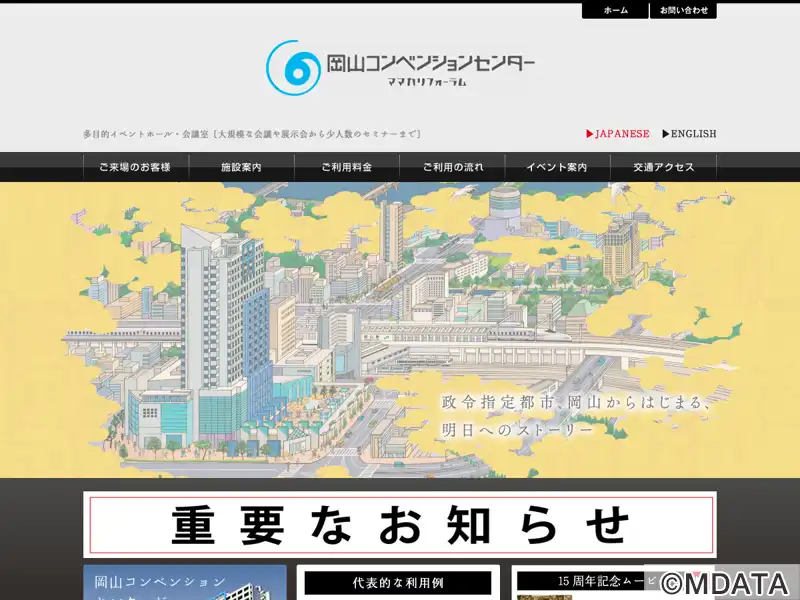 JR岡山駅西口に2001年6月開設された第三セクターのコンベンション施設。さまざまなタイプの会議室やホールを備え、大規模イベントから少人数のセミナーまで対応する。3F「コンベンションホール」は745㎡のフロアに、電動昇降ステージやロールバックチェアを完備する。1F「イベントホール」は搬入口に直結した磁器質タイルの多目的ホールで、天井ライトバトン8列を配置。レセプションホールや展示ホールも備える。