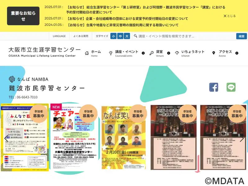 JR難波駅直結OCAT4階にある、市民学習や文化活動を支援する大阪市の公共施設。講堂、会議室、研修室、スタジオ、和室などが用意され、芸術文化・学習・交流の場となっている。貸しホールの「講堂」は定員120名、グランドピアノ完備で、アンサンブルコンサート、落語寄席、上映会、講演会などのイベントが開催されている。また、スタジオは定員30人で一面鏡張り、ディアパソンのアップライトピアノも完備する。