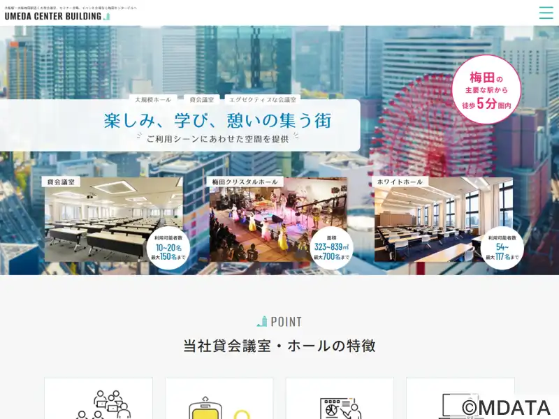 大阪梅田駅から約9分の梅田センタービルB1にある大規模イベントホール。天井高4.8mの広々とした空間は、2フロア吹き抜けのフリースペースとして利用可能。可動パーティションにより2つのエリアに分割することもできる。大型スクリーンや天井設置プロジェクターなどの設備、採光あふれるホワイエと控室が用意され、展示会、企業説明会など様々なイベントに対応する。用途に合わせた会議室や31階のホワイトホールもある。