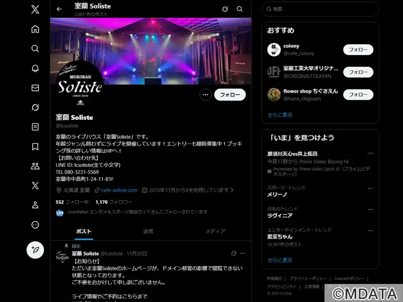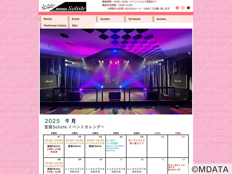 室蘭のライブハウス「ソリスト」は地元アマチュアからプロまでオールジャンル対応。週末を中心に地元アーティストなどによるライブを開催。ライブのジャンルによってはオールスタンディング・椅子席も対応。火・水・木・金曜日は練習用レンタルステージ(予約制)。年会費¥2,200。利用料お1人様1時間につき年会員:簡易PAによる生音練習¥660、ライブと同じPAでの練習¥1,100。
