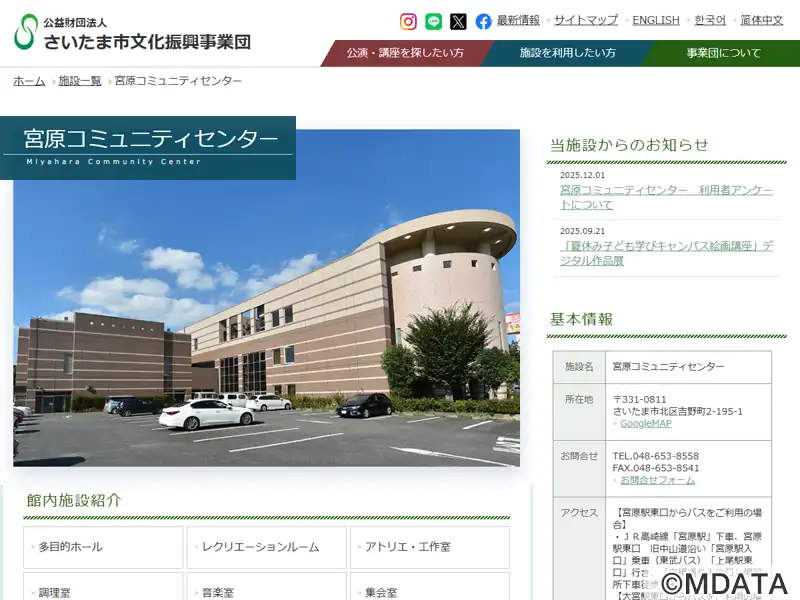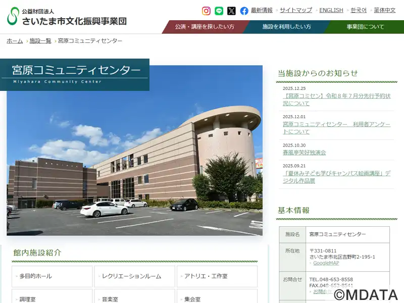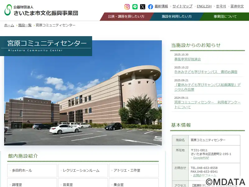 2000年4月に開館した「宮原コミセン」。最大312席の多目的ホールは舞台を使った発表会、カラオケサークルやアマチュアバンド、コミセン共催のコンサートのほか、ロールバック席を収納して約400㎡のフラットホールとして利用可能。グランドピアノYAMAHA C6付帯の音楽室(定員60名)、鏡張りのレクリエーションルーム、アトリエ・工作室、集会室、調理室、和室など様々な文化活動に対応。宮原図書館を併設。