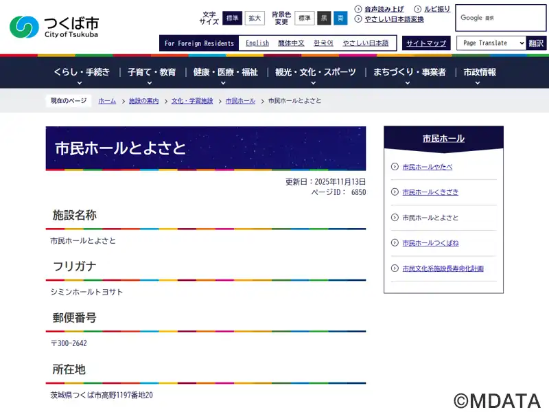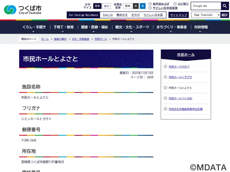 県道45号線沿いに1982年6月にオープンした市民ホール。市役所豊里庁舎や豊里公民館に隣接する、豊里交流センターとの複合施設で、市民の文化振興、教養の向上、市民福祉の増進を目指す。固定席697席の大ホールでは、コンサート、映画上映、講演会など、地域に密着したイベントが開催される。旧称、豊旧第五圏民センター、里圏民センターなど。豊里交流センター(旧豊里公民館)には図書室、会議室、研修室、展示室などを備える。